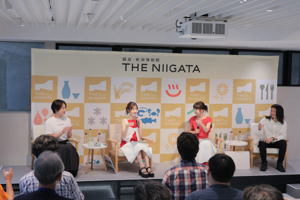 2部では、ゲストに「わたご酒店」アシスタントディレクターの山後 緑さん、「株式会社U・STYLE」デザイナーの松浦 柊太朗さんのお二人を加え、「今、気になる新潟のこと」をテーマにTHE NIIGATAのコンセプト「米・酒・雪・アート」にまつわる、若い世代同士ならではの最先端の新潟トークが展開されました。