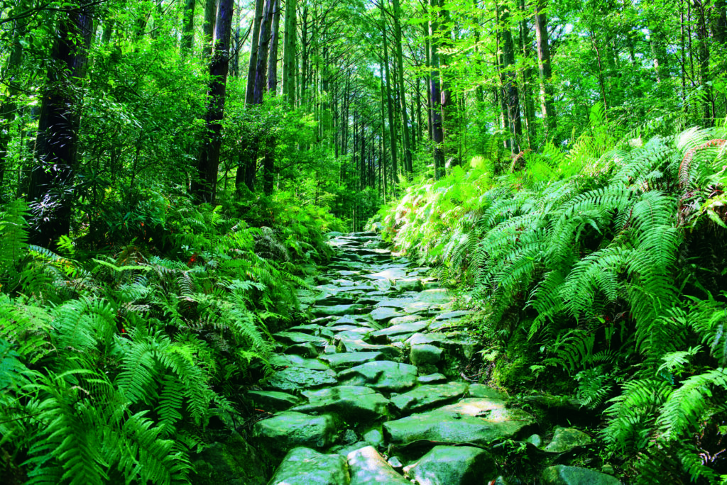 参詣道のうち熊野三山(熊野本宮大社、熊野速玉大社、熊野那智大社)に至る道を熊野参詣道といい、「熊野古道」の名で親しまれてきました。熊野古道には、各方面からの参詣の道として複数のルートがあり、三重県にある熊野古道伊勢路は、伊勢神宮と熊野三山を結ぶ約170㎞の巡礼道です。