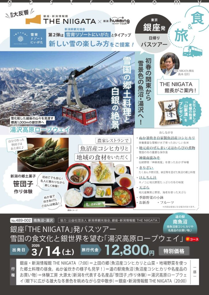 トップページ お知らせ 3/14(土)日帰り「銀座『THE NIIGATA』発バスツアー 第2弾 雪国の食文化と銀世界を望む「湯沢高原ロープウェイ」 / THE NIIGATA: Meet the People Vol.28」参加者募集のお知らせ
