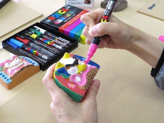 素焼きしてあるミニ鬼瓦に、自分の好きな色を塗ったりカラフルに描いたりして、自分だけのオリジナルミニ鬼瓦を作ることができます。(お1人様1,000円/税込)