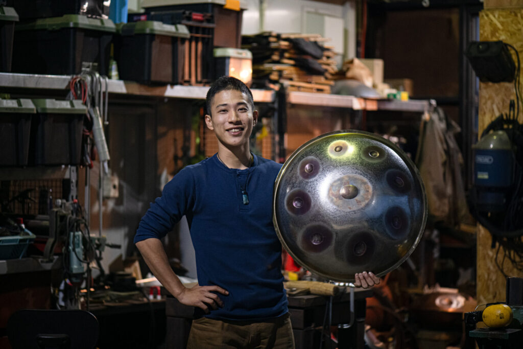 ものづくりの街・燕市に自身のアトリエ「響楽舎」を構え、日々、ハンドパンの製作、周知・普及に汗を流す時田清正さん(26歳)です。