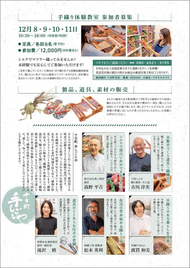 きものの産地として広く知られた、新潟県十日町市で活動する5名の織物の専門家「十日町 手しごとや」による、織物の「手織り体験教室」と「展示・販売」を開催します。