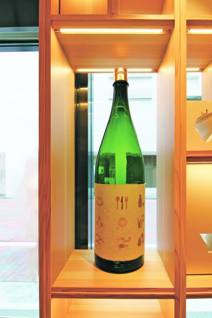 1 Fフロアの正面に展示されている一 際目を引く十升瓶は、ラベルにTHE NIIGATAのビジュアルモチーフがあしらわれています。ラベルは、長岡市で300年以上の歴史をもつ手漉き和紙「小国和紙」を使用した完全オリジナルです。2Fには日本酒の有料試飲コーナーがあり、お酒はTHE NIIGATAの目玉コンテンツの一つとなっています。