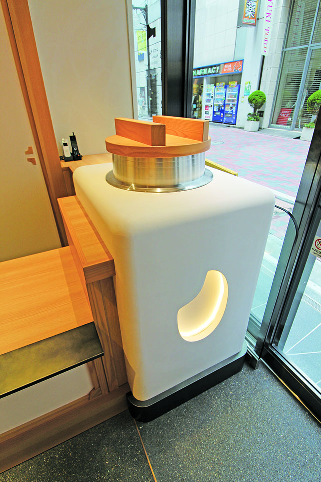 魚沼産コシヒカリのおにぎりを販売する「THE ONIGIRI・Ya」は、お米農家がつくった お にぎり屋さんをイメージしています。その隣には、ポップでかわいらしいデザインのかまどがあります。かまどは7 . 5升焚きの大きさで、蓋には新潟県産の杉木材を使用しています。