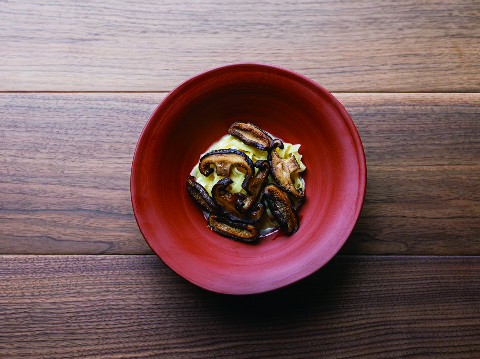 旬を迎えている肉厚の新潟県南魚沼産「八色椎茸」を分厚く切り、バターでローストした後に生クリームと和え、椎 茸の風 味を生クリームに馴染ませました。麺は新潟産の米粉を使った生パスタ。「山の鮑」とも言われる肉厚の椎茸とモチモチしたパスタが絶品です。