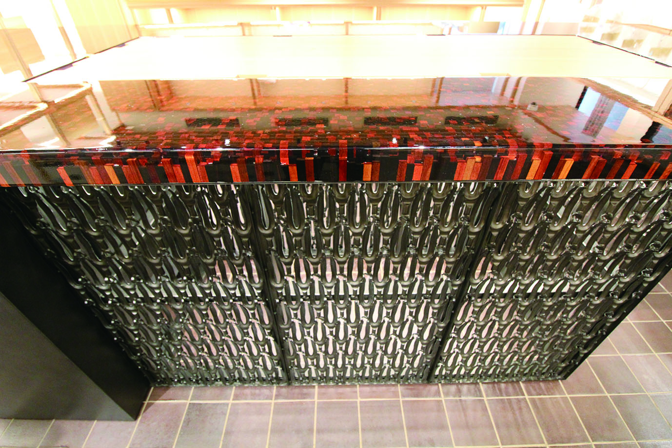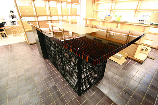 天板は黒檀・紫檀の箸の端材を特殊な樹脂で固め、脚部はステンレス刃物鋼の爪切りの廃材を組み立て直した特注テーブルです。新潟の良いものを無駄にしない、ものづくりへのリスペクトを表現しています。天板の箸の端材は、「マルナオ株式会社」、脚部の爪切りの廃材 は、「諏訪田製作所」のものを使用しています。