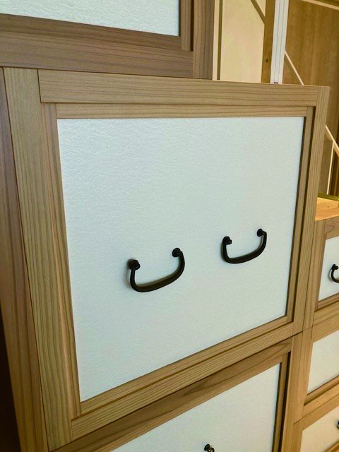 新潟の生活の記憶を呼び起こす、加茂桐箪笥の古い取手をリユースしています。加茂桐箪笥は、220年以上の歴史を持つ新潟を代表する伝統家具です。