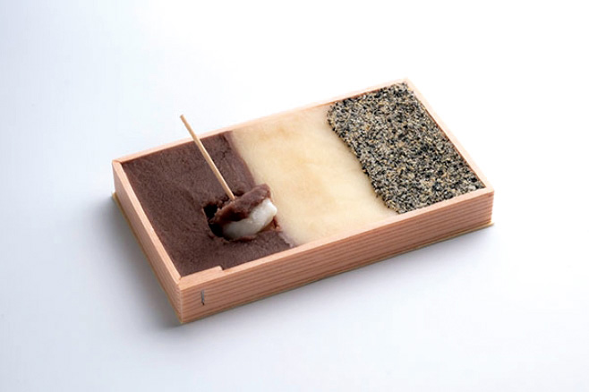 手作業で約4時間かけて練り上げるあんこは、北海道産大納言小豆の風味を感じるつぶしあん。県産米粉から作った求肥とあんこが口の中で一体となって口溶けはなめらか。