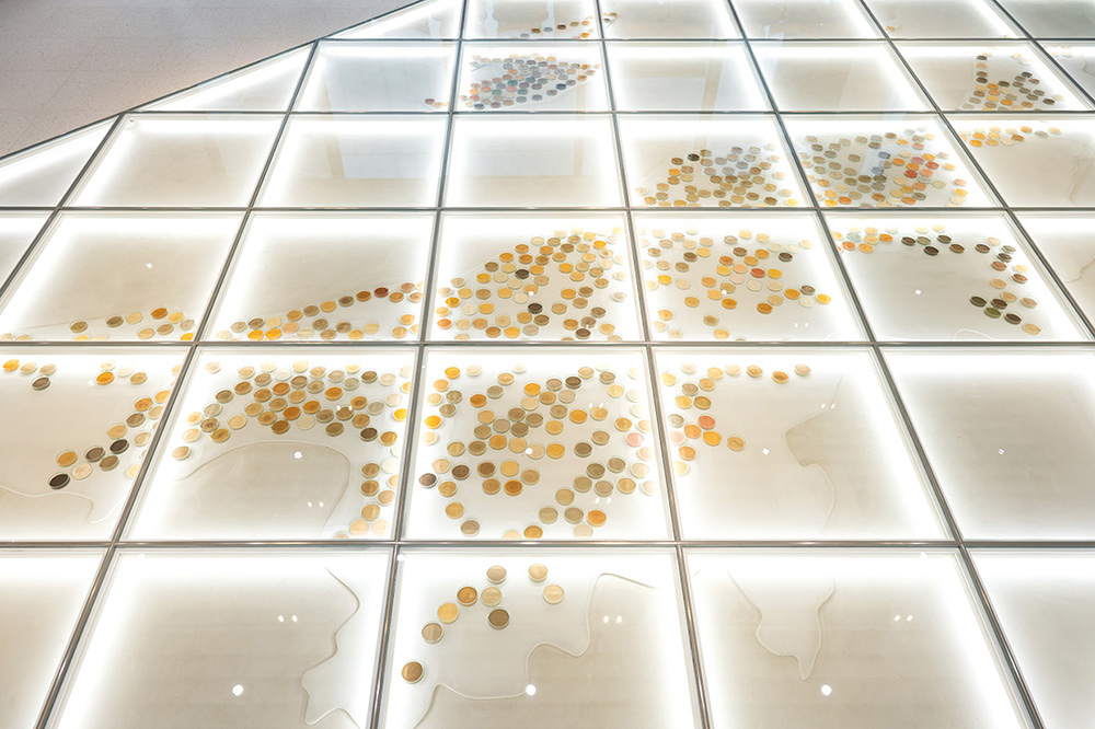 新潟県112市町村(平成の大合併 以前)594集落で集められた705箇所の土が並べられている床面のアート作品。土は田んぼや畑、裏山から一握りだけ手で採集されたものです。多様な色の土は全て自然のままの色で、土の性質によって、乾いた時のひびの割れ方が異なることも魅力です。(作者:栗田 宏一 氏)
