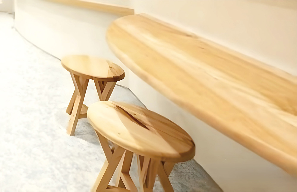 B1Fの移住相談窓口に設置されているカウンター天板は、新潟県産の「真樺」を使用しています。木肌のよい表情と特徴的な縮みは雪国の厳しい環境で育った証です。