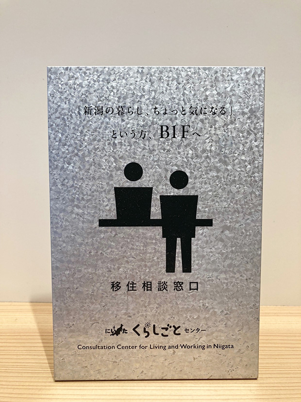 THE NIIGATAフロア全体の案内板には、「金物の町」として知られる燕三条地域から仕入れた「ガルバリウム鋼板」を使用しています。耐久性に優れていて、様々な用途に活用されている鋼板です。