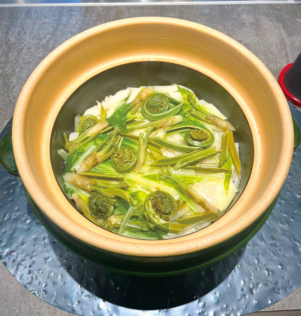 「京都 八代目儀兵衛」さん監修の下、特注の有田焼のお釜と1分毎に火力が変わる専用のコンロで、刈羽村産の「新之助」を、新潟で採った香り豊かな山菜と一緒に、一番出汁で炊き上げます。