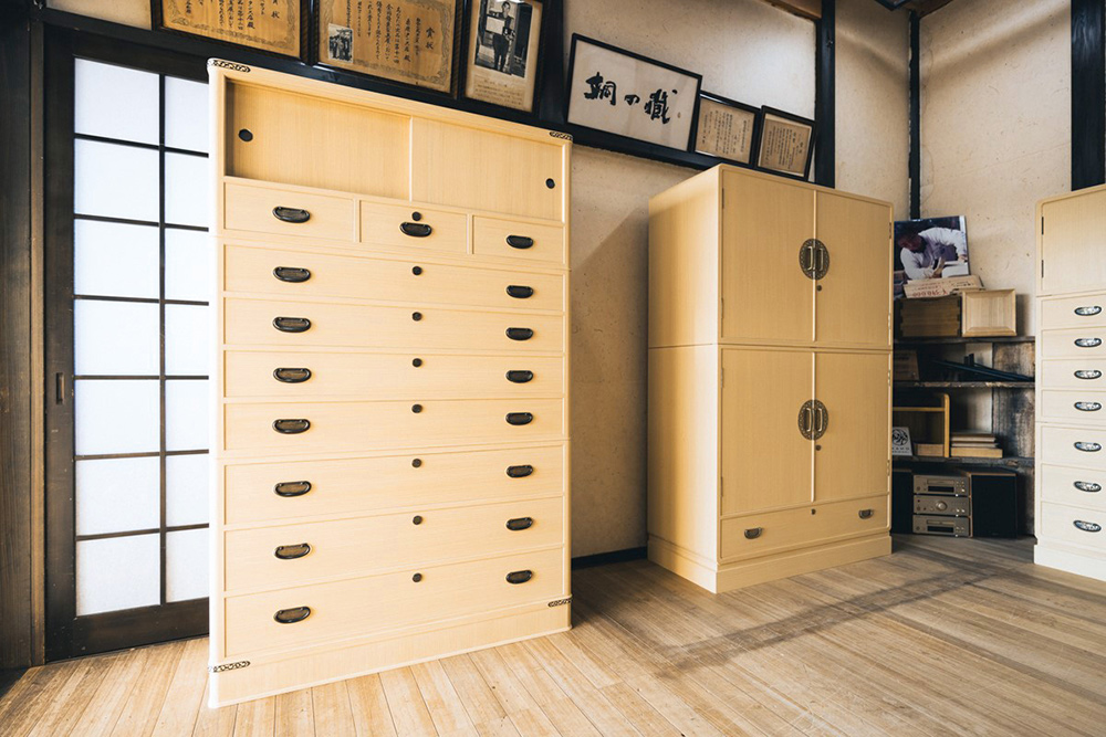 「加茂桐箪笥」は、職人が生み出す美しい木目と木肌のぬくもりを感じることのできる家具の最高級品で、新潟県の伝統工芸品に指定されています。金釘を使わずに板と板を組む「指し物」 技術で、空気の漏れ出る隙間もないほどの精度が強みです。また、古くなっても表面を削るなどして再生できるため、100年以上長持ちすると言われています。 加茂市は現在、日本最大の桐箪笥生産量を誇っています。