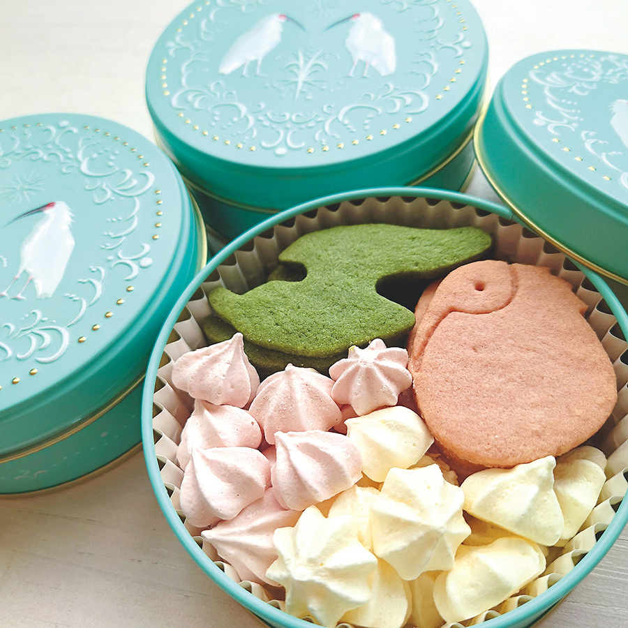 ベーカリーカフェが手掛ける人気のお菓子セット。オリジナルデザインの缶の中に、佐渡の形の抹茶クッキー、可愛らしい朱鷺クッキー、紅白のメレンゲ菓子が入っています。