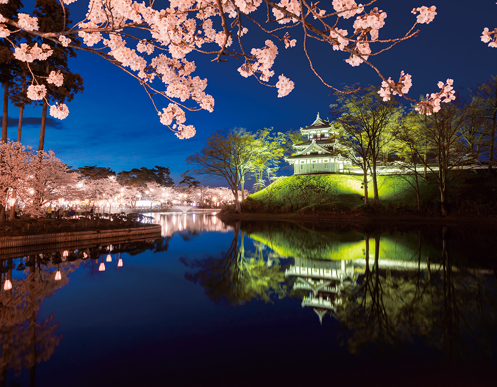 徳川家康の六男・松平忠輝公の居城として築城された高田城跡に整備した公園とその周辺を含めて、約4,000本の桜が咲き誇ります。ライトアップされた高田城三重櫓と、約3,000個のぼんぼりに照らされた桜がお堀の水面に映る様は壮観です。今年100回目を迎える「高田城址公園観桜会」は、3月28日(金)~4月13日(日)に開催。ぜひ、お越しを。
