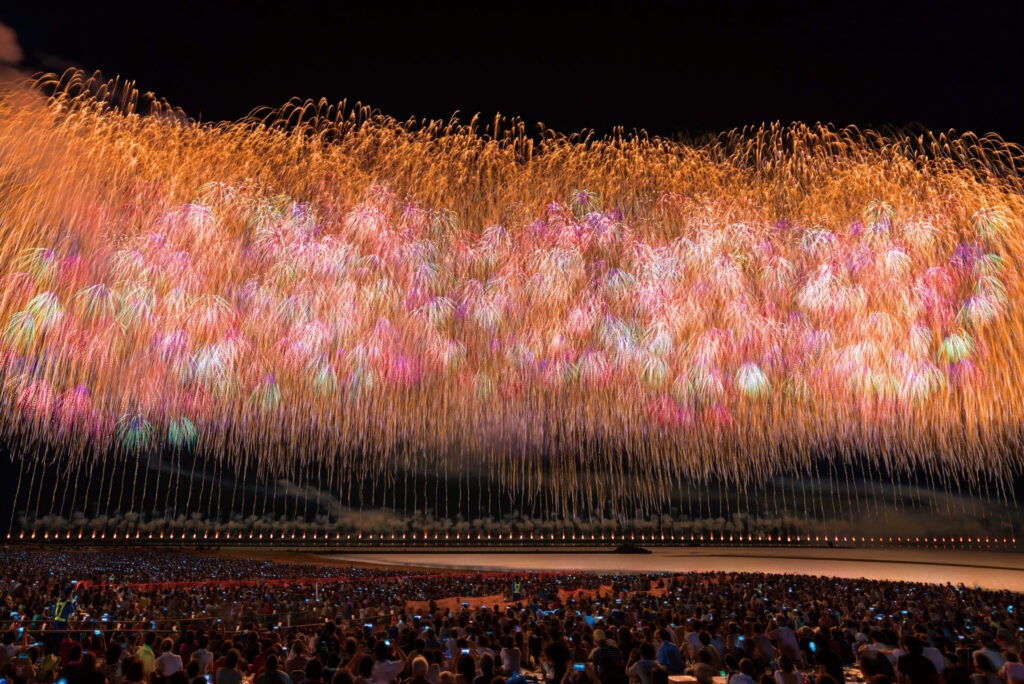 世界に類を見ない打ち上げ範囲の広さが最大の魅力。長さ600メートルの堤防で打ち上げる「ワイドスターマイン」、海に向かって打ち込まれる「海中空スターマイン」、大迫力の尺玉100 発一斉打上など、豪華絢爛な花火が次々と日本海に打ち上がります。