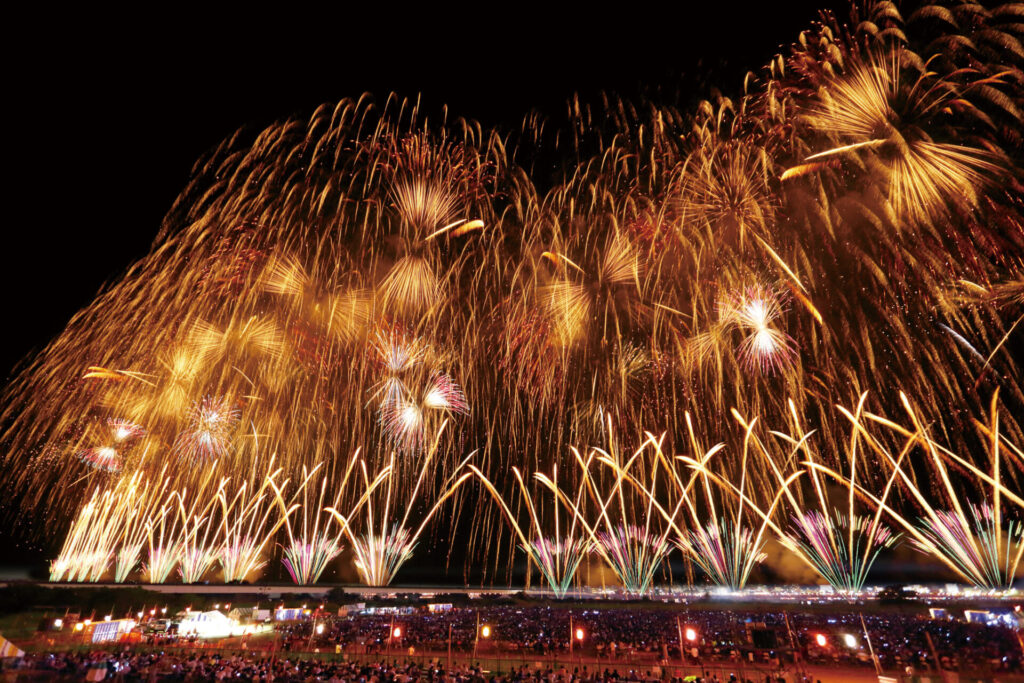 直径650メートルの大輪の花「正三尺玉」、打ち上げ幅約2キロに及ぶ「復興祈願花火フェニックス」など壮大な花火の数々が夜空を彩ります。長岡空襲で亡くなられた方々への慰霊と長岡の復興を願って開催された「長岡復興祭」を起源とする、市民の思いが込められた花火大会です。