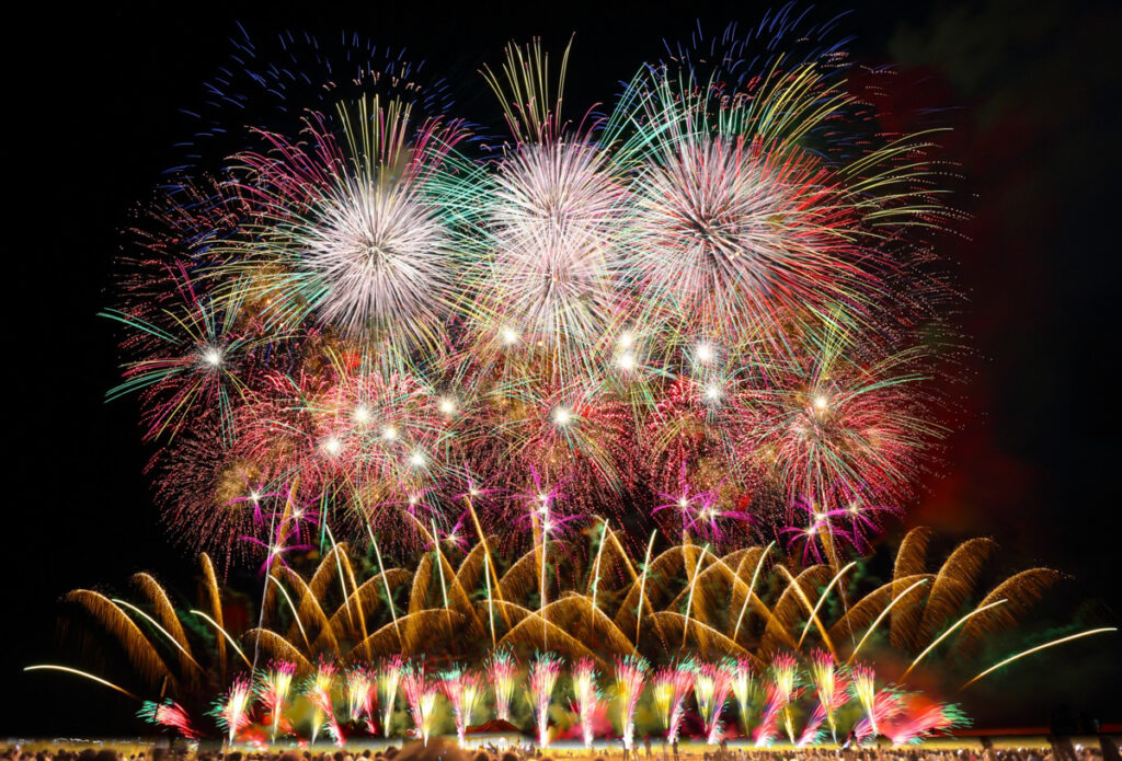 小千谷市片貝町の「片貝まつり」では、日本一の大きさを誇る四尺玉(直径約120cm/開花時の直径約700m)が打ち揚げられます。