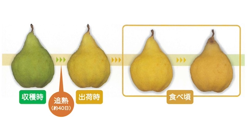 ル レクチエ〉をはじめとする西洋梨がもつ特徴のひとつとして、「木になった状態では完熟しない」というものがあります。そのため、〈ル レクチエ〉の収穫から出荷までに要する期間である約40日間、しっかりとした管理のもとで「追熟」が行われます。