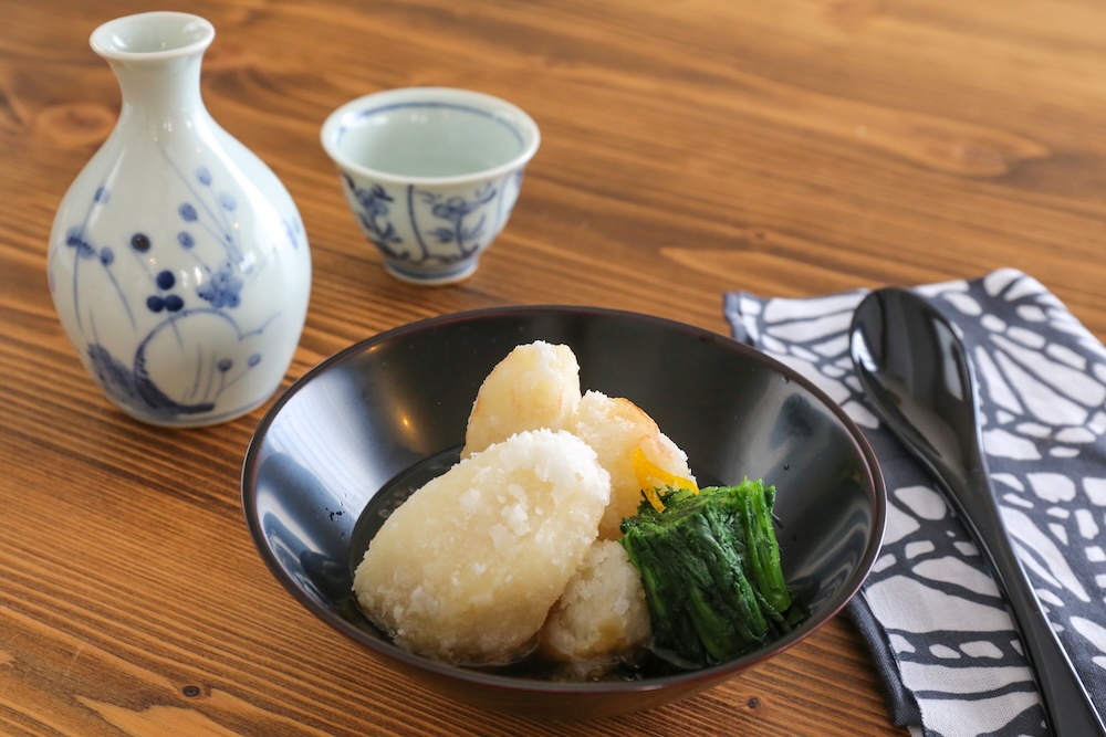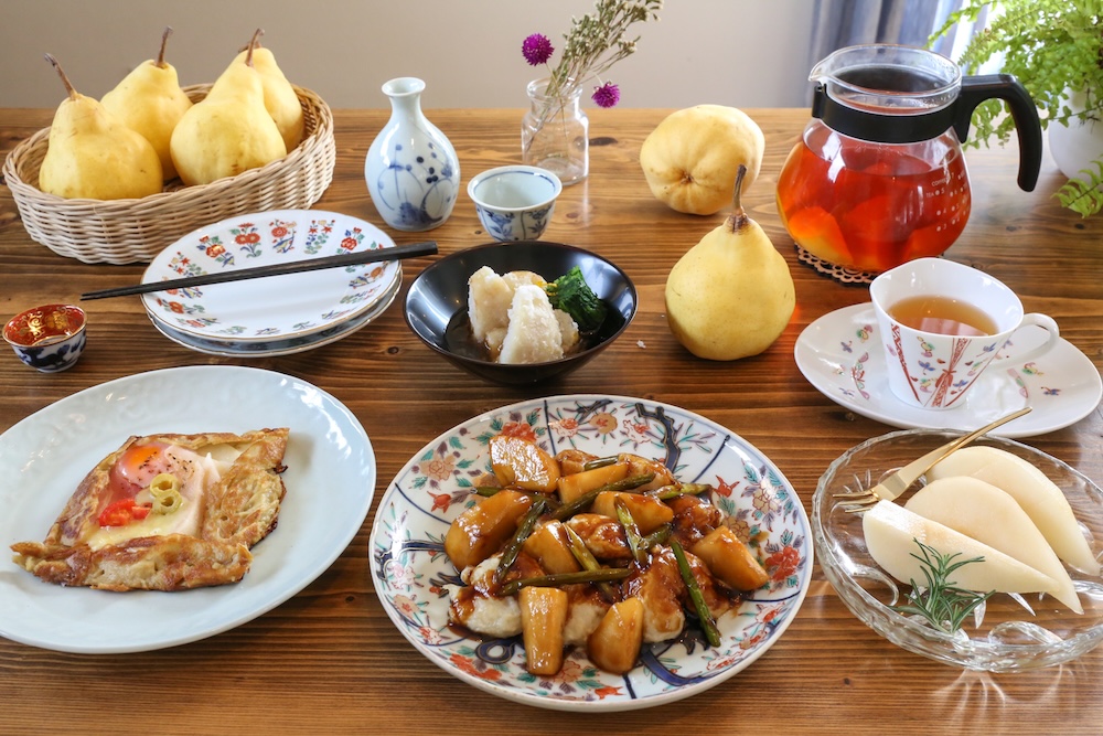 片栗粉をまぶして油で揚げた「〈ル レクチエ〉の揚げ出し」は、甘みと酸味のバランスがとれた〈ル レクチエ〉に、和風だしがよく合う「和」のおかずです。春菊やゆずの皮を添えれば、華やかで上品なひと皿に。ねっとりとした果実と、サクッとした衣の食感の違いもぜひ楽しんでみてください。