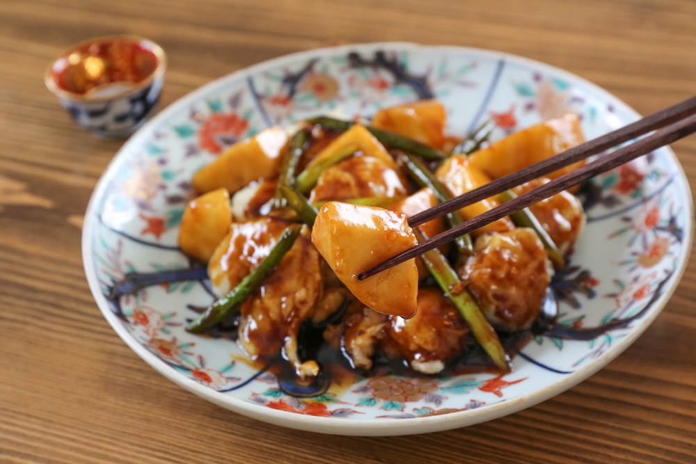 〈ル レクチエ〉をたっぷりの海鮮と一緒に炒めた中華のひと皿「〈ル レクチエ〉と海鮮の黒酢あん」。黒酢の甘酸っぱさや、海鮮の旨みでご飯がすすみます。意外性のある組み合わせですが、実は絶品! 果実は炒めすぎないのがポイント。