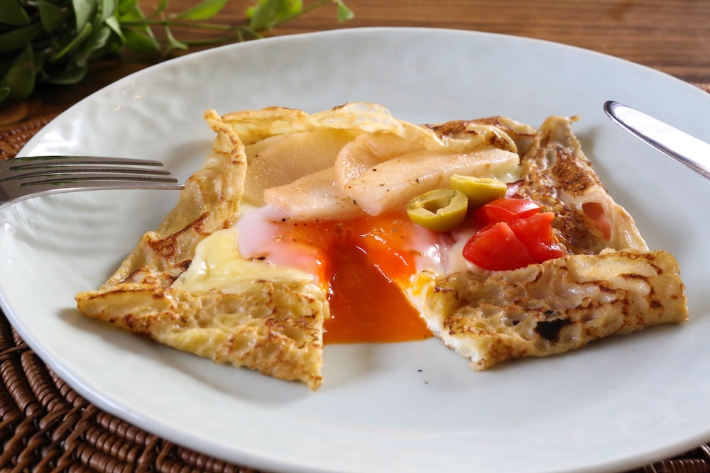 おしゃれな朝食やおもてなしにもぴったりな「〈ル レクチエ〉のガレット」。そば粉を使って生地から手づくりするレシピです。素材それぞれが持つ、甘みと酸味、塩気のバランスがとれたひと皿で、半熟卵の黄身を絡めながらいただきましょう。