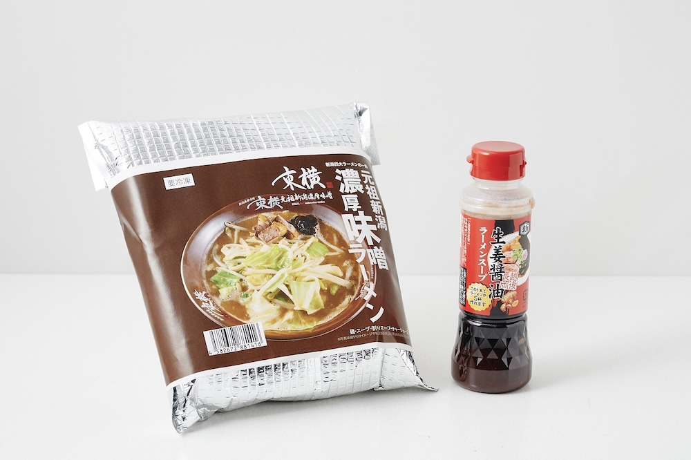 〈THE NIIGATA〉では、新潟の人気ラーメン店〈元祖新潟濃厚味噌 東横〉の味を自宅で楽しめる商品〈元祖新潟濃厚味噌らーめん〉(写真左)が購入できます。麺と具入りのスープのほか、新潟濃厚味噌ラーメンの特徴でもある割りスープが入っているので、おいしさを最後まで堪能できます。