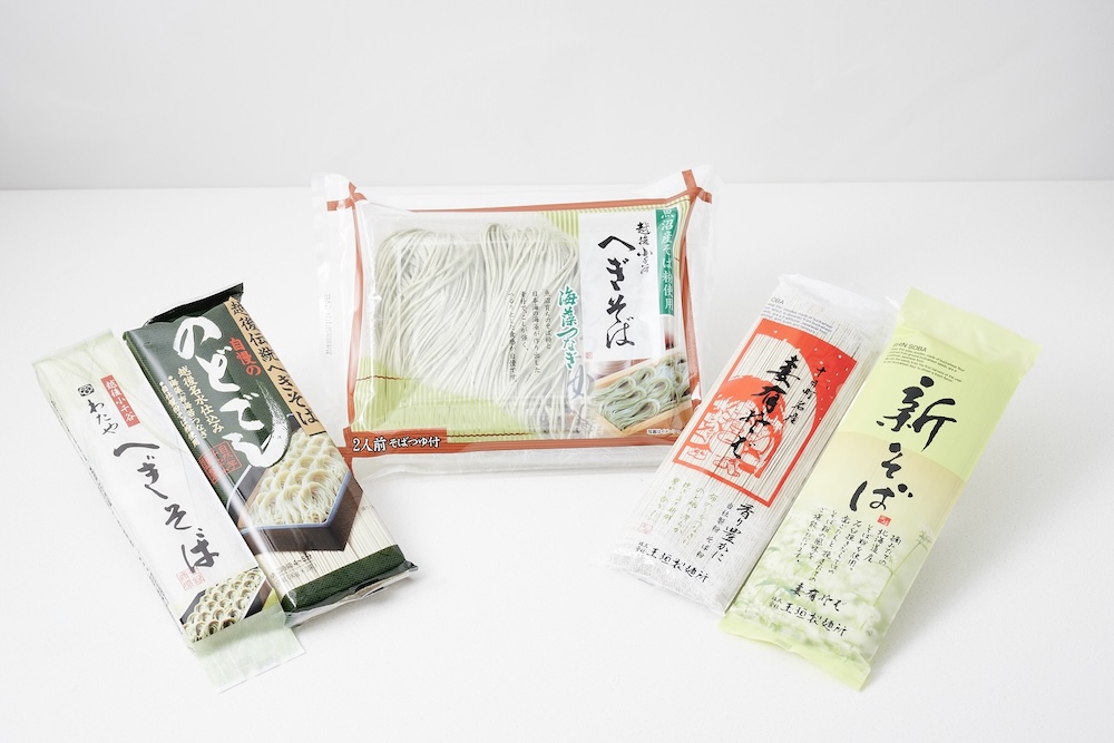 へぎそば発祥の店として知られる創業100年を超える老舗〈わたや〉の〈わたやへぎそば〉(写真左)、上越の名水を製麺水に使った〈へぎそば自慢ののどごし〉(写真中左)、累計5000万食販売の〈妻有そば〉(写真中右)、同店より発売されている〈新そば〉(写真右)などバラエティも豊か。