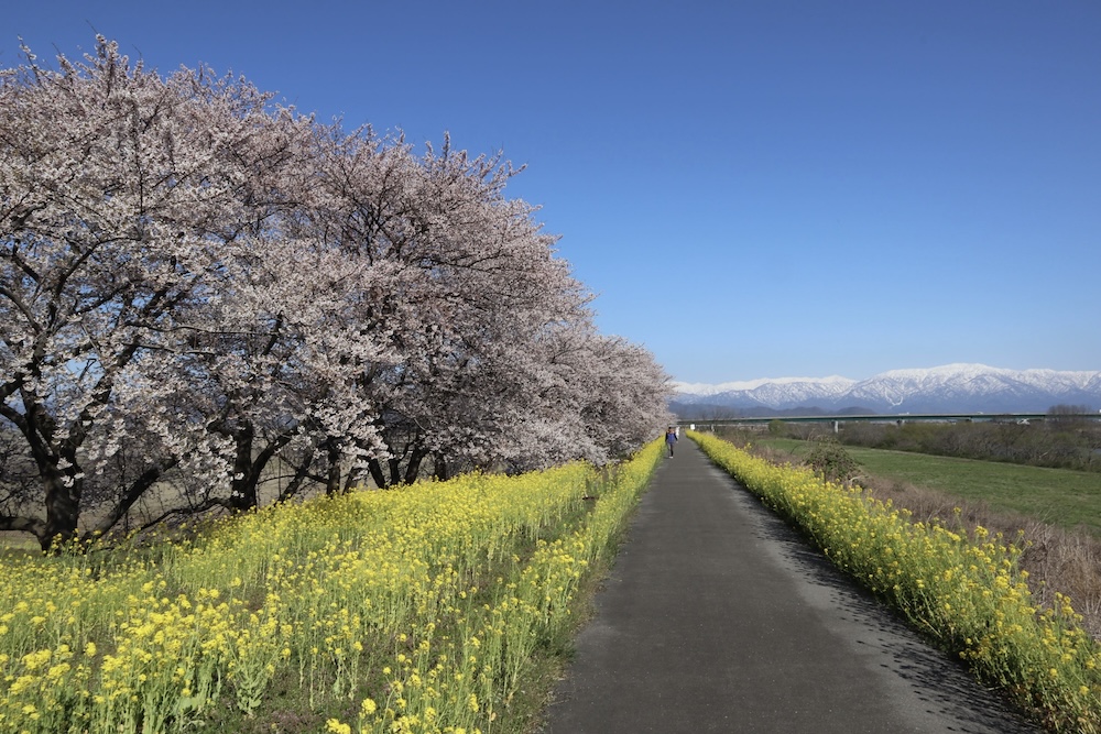 県北に位置している人気のお花見スポットのひとつが、新発田市にある〈加治川堤〉です。かつては「加治川 長堤十里 世界一」とも言われた場所で、春になると加治川沿いに約2000本の〈ソメイヨシノ〉が咲き乱れます。
