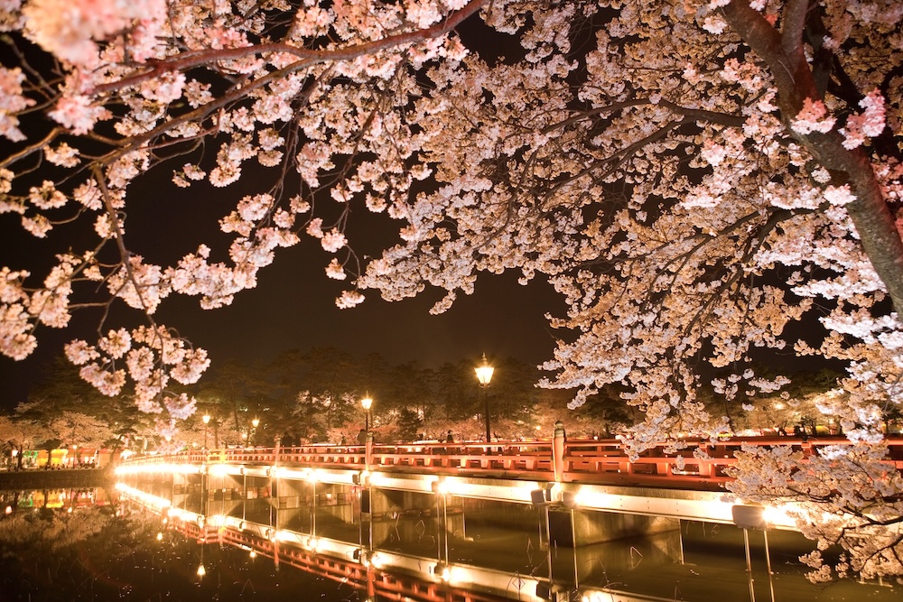 特に約3000個のぼんぼりに照らされた夜桜の美しさは圧巻で、東京都の〈上野恩賜公園〉、青森県の〈弘前城公園〉とともに〈日本三大夜桜〉のひとつに数えられています。